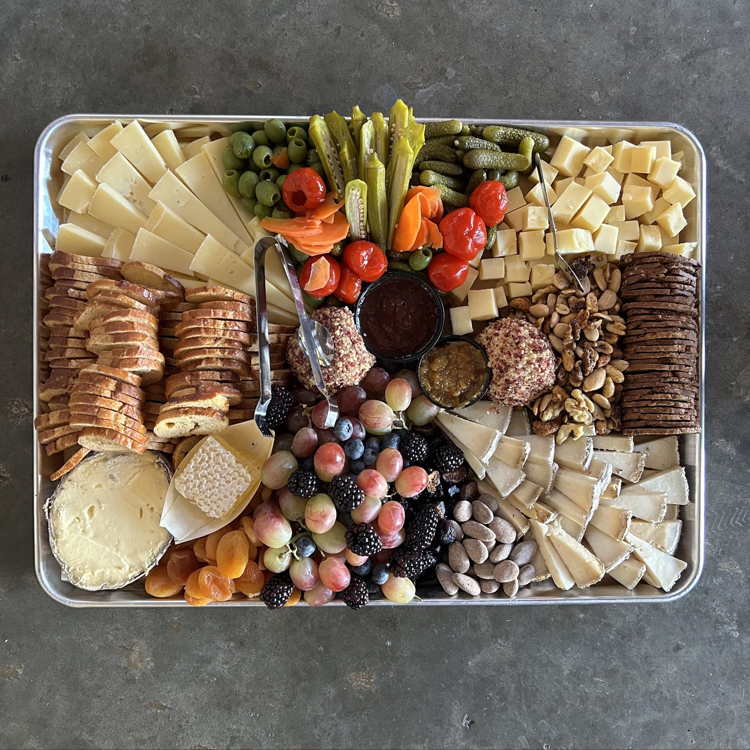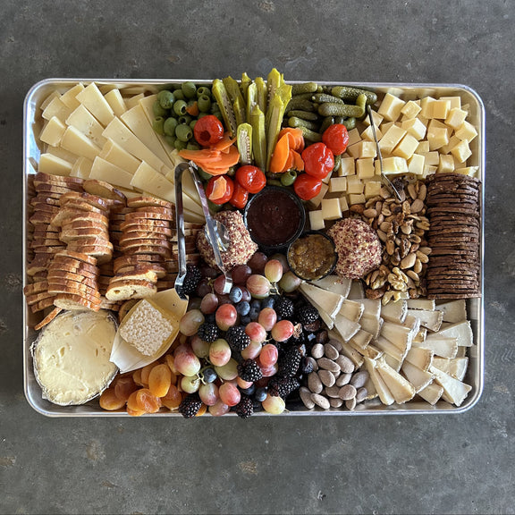 Our Monger’s Select option features a rotating selection of cheeses curated by our expert mongers to ensure seasonal quality and a premium cheese experience. If you have particular cheeses you would like we will do our best to accommodate almost all special cheese requests on the Monger's Select offering. As with all our platters, we include a variety of flavors and textures and our standard accoutrement. Sample Selection (changes daily) Humboldt Fog, Pleasant Ridge Reserve, Sbrinz Alpine, Roquefort Blue. Comes with your choice of our signature cheese ball, marcona almonds, castelvetrano olives, cornichons, grapes, dried apricots, figs, house made crostini, cranberry/pumpkin seed crackers, and house-made jam.